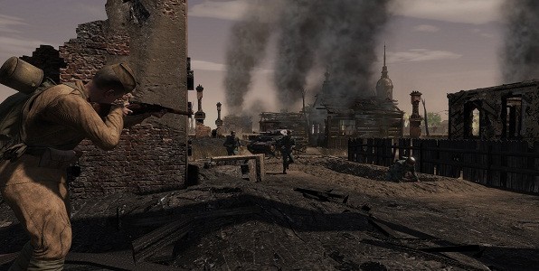 My team has been trying to capture a crucial church from Russian forces. The Russian team is heavily fortified, with machine gunner crews in the windows, snipers in the tower, and riflemen dotting the landscape as we try to make our advance. Our squad leader finally reaches the line, pops a smoke grenade, and our team makes an advance under its cover. As I sprint to the far end of the building, I spot three enemies behind cover that haven’t noticed me. I find sandbags and find cover behind them, pulling out my rifle. I take careful aim at one of the enemies, steady my breath to increase accuracy, and squeeze the trigger. The player goes down, a 73 meter kill. The shot alarms the rest of the opposing team and a sniper fires. The bullet connects and I fall to the ground, the screen slowly fading to black as I bleed out, watching my fellow teammates continue a slow assault on the church. This is Red Orchestra 2: Heroes of Stalingrad.